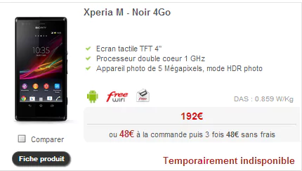 On retrouve ainsi le Sony Xperia M Noir 4 Go qui avait fait son apparition en remplacement de la version blanche en décembre dernier. Il est vendu 192 € comptant, 48 € sur 4 mensualités sans frais.