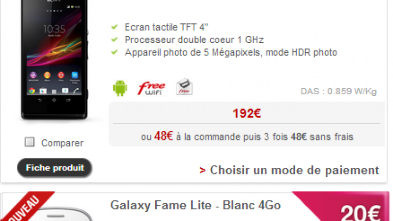 Le Sony Xperia M Noir 4Go vendu 192 € et le Samsung Galaxy Fame Light vendu 109 € peuvent à nouveau être achetés sur la plateforme Free Mobile.