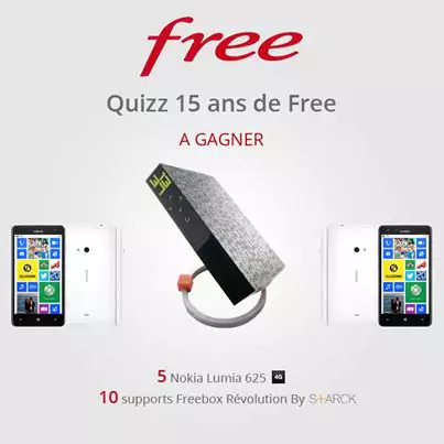 Pour ce Quizz qui se déroule du 06 au 16 mars 2014, 5 Nokia Lumia 625 d’une valeur de de 201 € sont mis en jeu. 10 supports Freebox Révolution sont également à gagner.