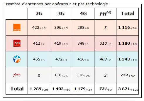 (4) FH (faisceau hertzien) : Système de transmission entre les antennes relais. N’est jamais directement capté par un mobile. (chiffre non comptabilisé dans le total des antennes).