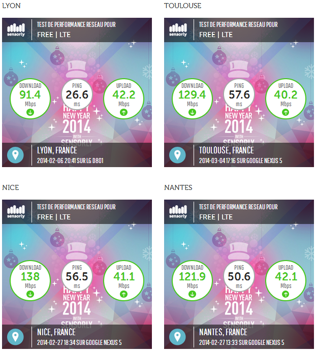 Bordeaux annonce un speedtest réalisé mercredi, à 17h35, sur un Nexus 5, à 139,3 Mbits (+18,3 Mbits par rapport au précédent record). Nice accroche 138 Mbits, le 27 février à 18h34, également sur un Nexus 5.