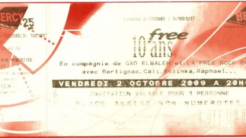 Pourtant, tous les anniversaires de Free n’ont pas été aussi chiches, comme nous le rappelle romano64 sur le forum Univers Freebox. Ce Freenaute a retrouvé les billets de la Free Rocks Party, que Free avait organisé à Bercy pour ses 10 ans :