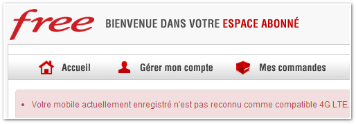 Exit le volume de data de 20Go par mois, retour à 3Go. Depuis plusieurs jours, certains abonnés Free Mobile peinent à activer le service 4G sur leur terminaux mobiles, bien qu’ils soient compatibles 4G LTE sur la bande 2600 MHz. L’option 4G n’est pas prise en compte ou se désactive subitement après plusieurs jours/semaines de bons et loyaux services. Un message indique alors aux abonnés concernés : « Votre mobile actuellement enregistré n’est pas reconnu comme compatible 4G LTE ».