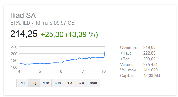 La Bourse a très vite réagi aux bons résultats présentés ce matin par Iliad. La hausse de 19% du chiffre d’affaires, les 8 040 000 abonnés mobile et 5 640 000 d’abonnés haut débit n’ont pas laissé indifférents les marchés financiers. A 9h45, l’action Iliad atteint 213,90€ (en augmentation de 13,2%), plaçant littéralement aux oubliettes le précédent record (188,95€) ! Au plus haut, l’action a atteint 222,85€ ! Désormais, Iliad est valorisé 12,3 milliards d’euros (contre 10,8 milliards d’euros vendredi 7 mardi dernier).
