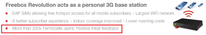 De nombreuses informations ressortent des résultats annuels 2013 du groupe Iliad. On apprend notamment que plus de 200 000 Femtocells sont en service chez les Freenautes. Lancé en juin 2013, ce mini-boîtier relais qui s’insère à l’arrière de la Freebox Révolution (approximativement 50% du parc Freebox) permet de créer un petit réseau 3G à la maison.