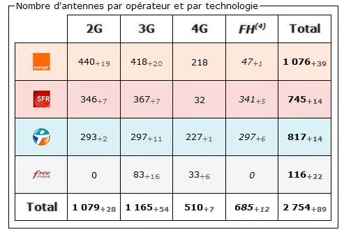 (4) FH (faisceau hertzien) : Système de transmission entre les antennes relais. N’est jamais directement capté par un mobile. (chiffre non comptabilisé dans le total des antennes).