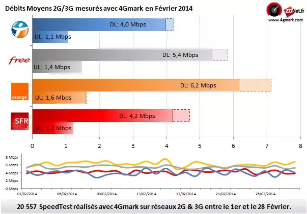 Comme chaque mois, le Baromètre 4G Monitor de 4Gmark publie le bilan des performances et des débits des réseaux mobiles des opérateurs, basé sur 63.652 mesures d’abonnés le mois dernier. Durant ce mois de février, Free a confirmé sa deuxième place derrière Orange, tant en 4G qu’en 3G. L’opérateur affiche ainsi un débit moyen descendant de 5,4 Mbps en 3G et 24,4 Mbps en 4G.
