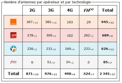 (4) FH (faisceau hertzien) : Système de transmission entre les antennes relais. N’est jamais directement capté par un mobile. (chiffre non comptabilisé dans le total des antennes).