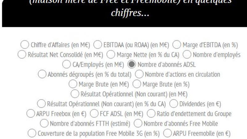 Le compte Twitter @frilliad a réalisé une infographie compilant tous les chiffres importants d’Iliad/Free. Sur une seule page, il est ainsi possible de découvrir la progression du nombre d’employés, d’abonnés fixes et mobiles, ou encore le chiffre d’affaires et le résultat net au cours de ces dernières années.