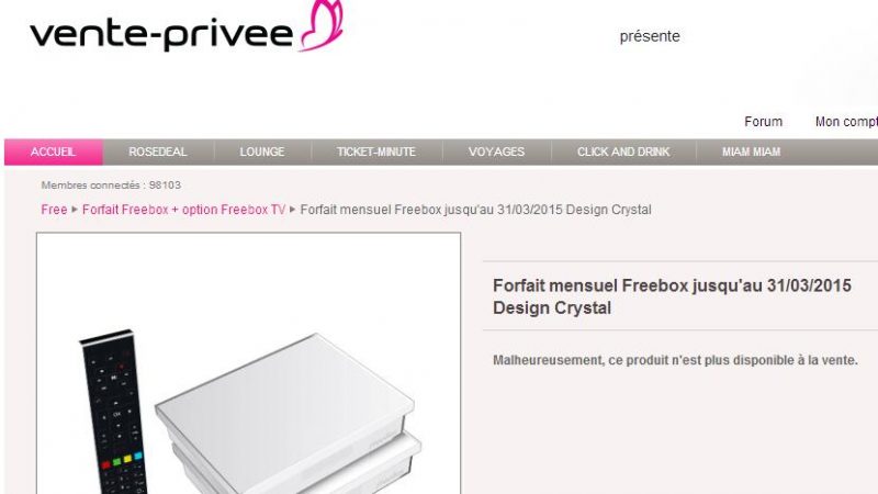 Alors que Free lançait ce matin une nouvelle offre Freebox Crystal à 1,99€/mois pendant un an sur vente Privée, celle-ci n’est déjà plus disponible en ce début de la soirée (voir captures ci-dessous). Une situation étonnante puisqu’habituellement, cette offre est non seulement disponible durant toute la période annoncée (jusqu’au mardi 18 mars dans le cas présent) mais est même souvent prolongée de plusieurs jours.