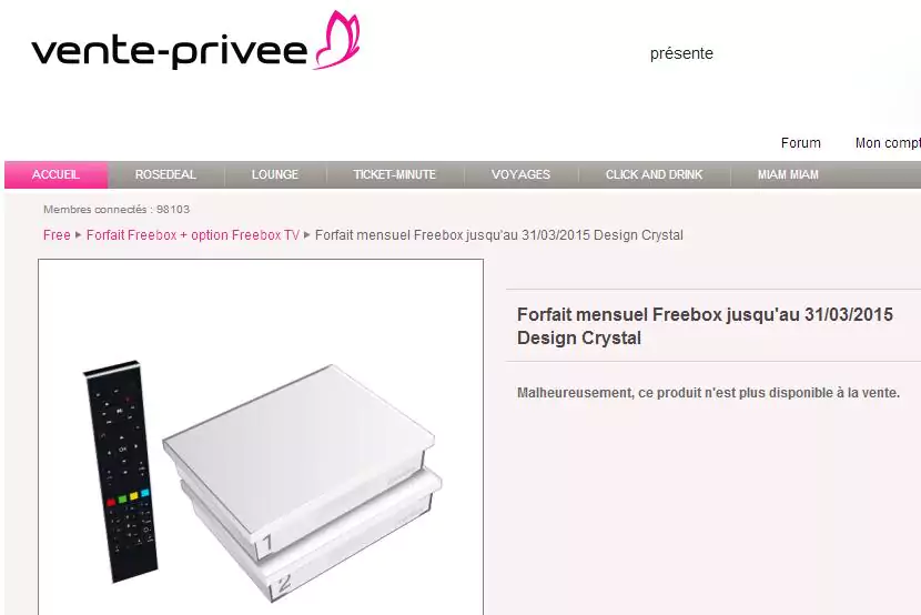 Alors que Free lançait ce matin une nouvelle offre Freebox Crystal à 1,99€/mois pendant un an sur vente Privée, celle-ci n’est déjà plus disponible en ce début de la soirée (voir captures ci-dessous). Une situation étonnante puisqu’habituellement, cette offre est non seulement disponible durant toute la période annoncée (jusqu’au mardi 18 mars dans le cas présent) mais est même souvent prolongée de plusieurs jours.
