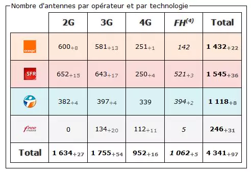 (4) FH (faisceau hertzien) : Système de transmission entre les antennes relais. N’est jamais directement capté par un mobile. (chiffre non comptabilisé dans le total des antennes).