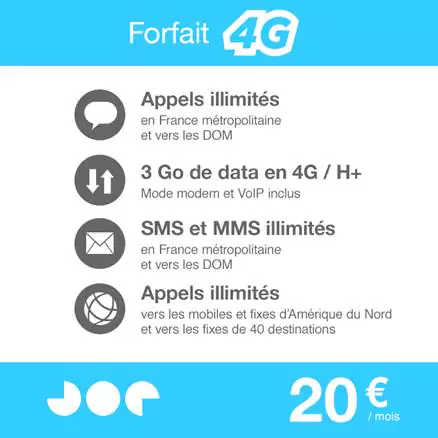 Nous l’évoquions ensemble cette nuit, c’est désormais officiel, Joe Mobile inclut la 4G dans son forfait personnalisable à 20€/mois. L’offre propose les appels illimités en France métropolitaine et vers les DOM, les appels illimités vers les mobiles et fixes d’Amérique du Nord et vers les fixes de 40 destinations, les SMS et MMS illimités en France métropolitaine et vers les DOM, et seulement 3 Go de data en H+/4G (Mode modem et VoIP autorisés. Il faut recharger une fois le volume de data épuisé). L’offre 4G à 20€ de Joe Mobile s’aligne ainsi sur celle de B&You à 19,99€/mois (24/24 & Internet 3Go).