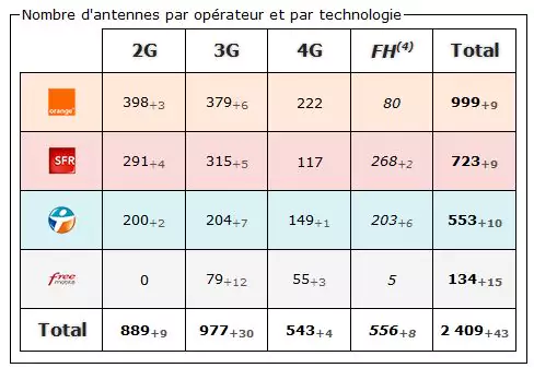(4) FH (faisceau hertzien) : Système de transmission entre les antennes relais. N’est jamais directement capté par un mobile. (chiffre non comptabilisé dans le total des antennes).