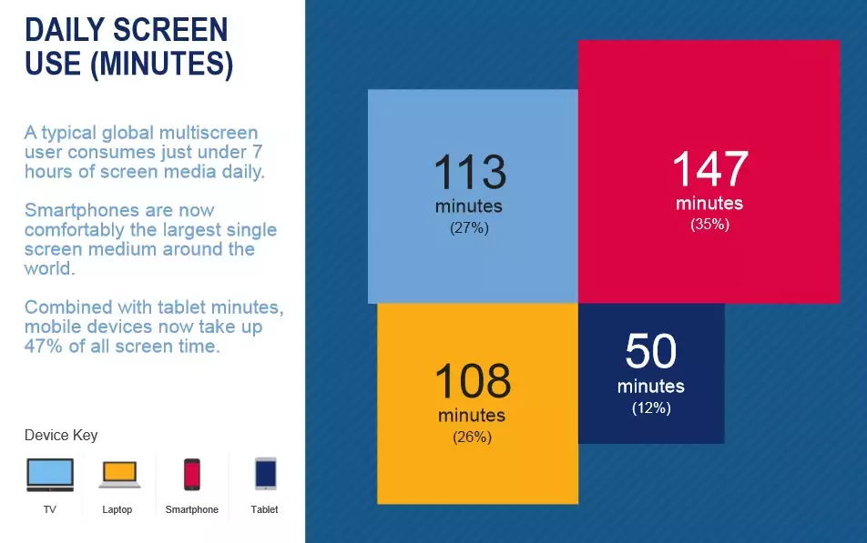 En effet, le temps passé sur un smartphone atteint désormais en moyenne 2h27 par jours, contre 1h53 pour la télévision, sur un total de 417 minutes passés devant un écran.