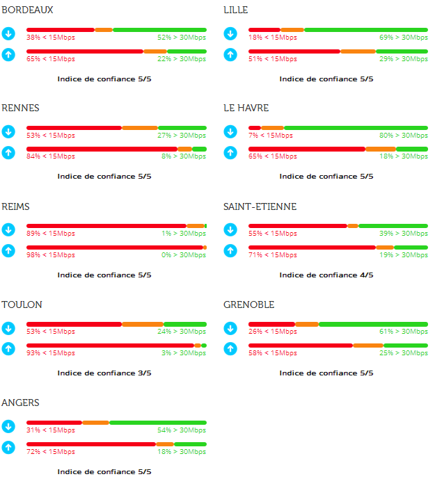 Sur les 17 villes 9 villes ont désormais dépassé dans la réalité les débits théoriques de Bouygues et SFR pour leur débit maximum :