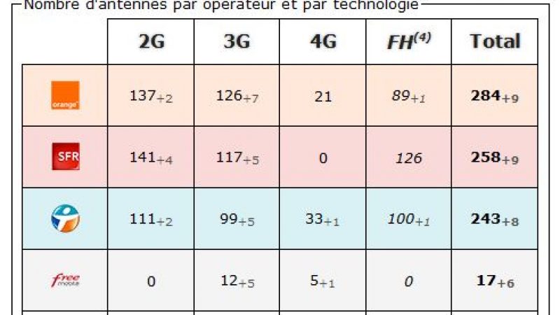 4) FH (faisceau hertzien) : Système de transmission entre les antennes relais. N’est jamais directement capté par un mobile. (chiffre non comptabilisé dans le total des antennes).