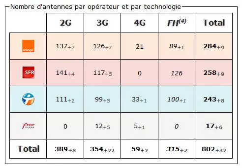 4) FH (faisceau hertzien) : Système de transmission entre les antennes relais. N’est jamais directement capté par un mobile. (chiffre non comptabilisé dans le total des antennes).