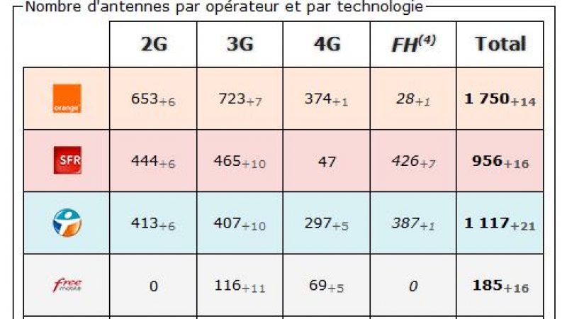 4) FH (faisceau hertzien) : Système de transmission entre les antennes relais. N’est jamais directement capté par un mobile. (chiffre non comptabilisé dans le total des antennes).