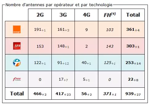 4) FH (faisceau hertzien) : Système de transmission entre les antennes relais. N’est jamais directement capté par un mobile. (chiffre non comptabilisé dans le total des antennes).