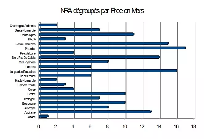 Suite à vos demandes, chaque fin de mois Univers Freebox fera le point sur le nombre réél de NRA dégroupés Free dans toute la France et plus précisément dans votre région, grâce aux données de stats-dégroupage.com. En ce mois de mars, ce n’est pas moins de 167 NRA que Free a raccordés à son réseau. Encore une belle performance qui dépasse le bilan de février. En voici un comparatif par région.