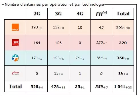 4) FH (faisceau hertzien) : Système de transmission entre les antennes relais. N’est jamais directement capté par un mobile. (chiffre non comptabilisé dans le total des antennes).