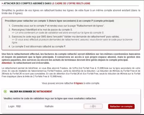 Munis de vos identifiants, vous pouvez ainsi, depuis votre espace abonné, procéder à un rattachement de ligne en insérant les identifiants du deuxième compte.