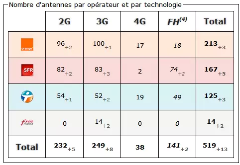 4) FH (faisceau hertzien) : Système de transmission entre les antennes relais. N’est jamais directement capté par un mobile. (chiffre non comptabilisé dans le total des antennes).