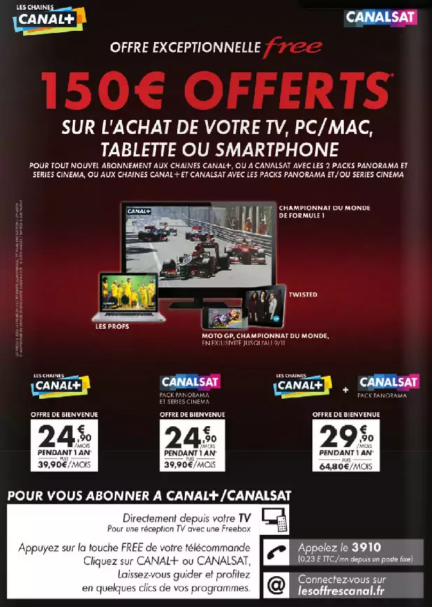 Jusqu’au 29 avril, Canal+ lance une nouvelle offre promotionnelle à destination des Freenautes proposant de rembourser 150 euros pour tout achat d’une TV, d’un PC, d’une tablette ou d’un Smartphone. Bien évidemment, il faut pour cela s’abonner à une des trois formules proposées :