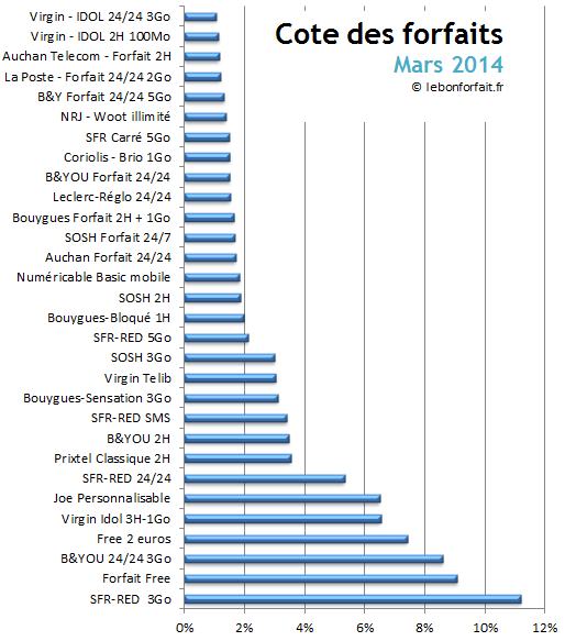 Au mois de mars, c’est Red de SFR qui crée la surprise en prenant la première place qui était occupée depuis plusieurs mois par Free Mobile. La marque low cost de SFR est ainsi passée de 7% des consultations à 18%. Ce soudain intérêt pour les forfaits Red s’explique par les promotions lancées début mars. Le forfait 2h est, par exemple, proposé à 1,99€/mois durant 6 mois au lieu de 4,99€, ou encore le forfait illimité avec 3Go proposé à 11,99€ durant 6 mois au lieu de 19,99€.