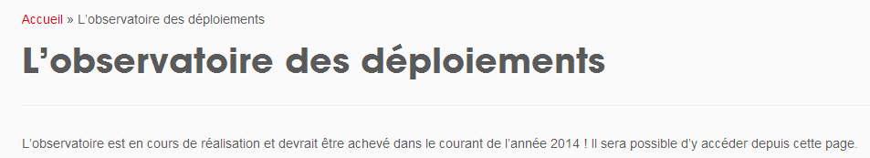 Un observatoire national des déploiements devait être lancé en avril 2014, pour offrir plus de visibilités aux zones déployées ou en cours de déploiement. À ce jour, le site est toujours "en construction".