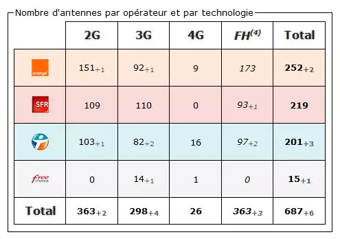4) FH (faisceau hertzien) : Système de transmission entre les antennes relais. N’est jamais directement capté par un mobile. (chiffre non comptabilisé dans le total des antennes).
