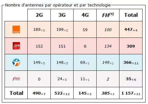 4) FH (faisceau hertzien) : Système de transmission entre les antennes relais. N’est jamais directement capté par un mobile. (chiffre non comptabilisé dans le total des antennes).