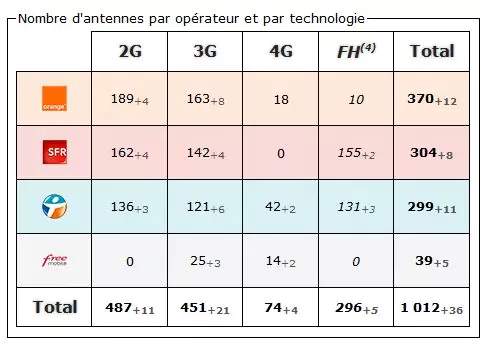 4) FH (faisceau hertzien) : Système de transmission entre les antennes relais. N’est jamais directement capté par un mobile. (chiffre non comptabilisé dans le total des antennes).
