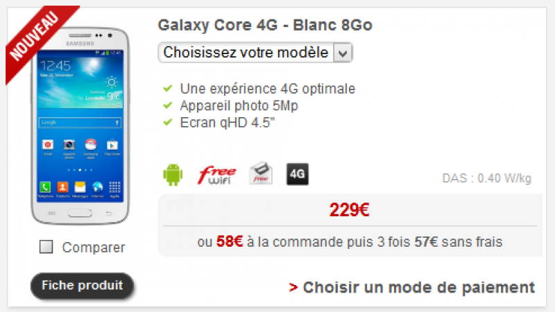 Un nouveau smartphone a fait son entrée sur la plateforme Free Mobile : le Samsung Galaxy Core 4G (en noir ou en blanc). Vendu 229 €, il enrichit la gamme des smartphones 4G vendus sous la barre des 250€. Il peut également être payé en 4 fois sans frais (58€ à la commande puis 3 mensualités de 57€) ou à crédit (en 24 mensualités).