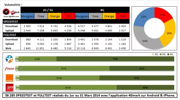 4G Mark et ZDNet viennent de publier le baromètre 4G Monitor pour le mois de mars. Ce dernier affiche le niveau de qualité de service des réseaux mobiles (3G, 3G+ et 4G) des quatre grands opérateurs. 4Gmark s’appuie sur les tests de connexion réalisés par les utilisateurs de son application mobile "4Gmark". Ces mesures offrent des indicateurs de débit en réception et en émission, mais aussi des tests de navigation sur les principaux sites internet, des transferts de fichiers.