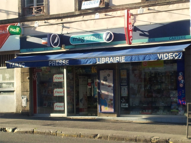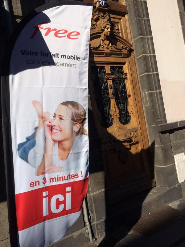 Pour le moment, une dizaine de ces bornes sont en fonctionnement, comme c’est le cas par exemple à Clermont Ferrand (voir photos ci-dessous). Et comme vous pouvez le constater, lorsqu’une borne Free est disponible dans une librairie, on ne peut pas la louper. Cela est annoncé à plusieurs reprises sur la vitrine, à l’intérieur du magasin, et pour certaines boutiques, il y a même des oriflammes devant l’entrée. Une façon pour ces espaces presse d’attirer de la clientèle et une façon pour Free de s’afficher dans les centres ville.