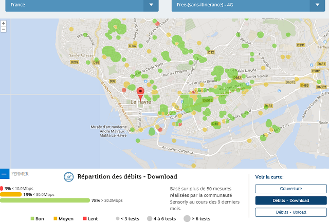 Il fait bon être abonné Free Mobile quand on habite Le Havre. Plus de 3/4 des connexions, mesurés par les abonnés sur l’application Sensorly, sont repartis avec un débit supérieur à 30 Mbits. Avec seulement 3 % des connexions inférieures à 10 Mbits, la ville du Havre fait partie des villes disposant des meilleurs débits Free Mobile. Certains quartiers de la ville normande mériteraient néanmoins d’être testés de manière plus approfondie.