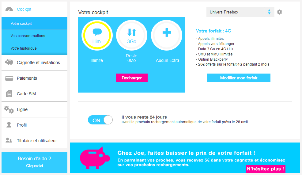 L’espace réservé aux abonnés Joe : simple mais complet.