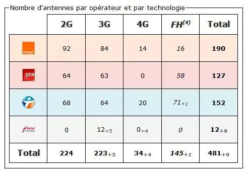 4) FH (faisceau hertzien) : Système de transmission entre les antennes relais. N’est jamais directement capté par un mobile. (chiffre non comptabilisé dans le total des antennes).