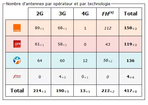 4) FH (faisceau hertzien) : Système de transmission entre les antennes relais. N’est jamais directement capté par un mobile. (chiffre non comptabilisé dans le total des antennes).