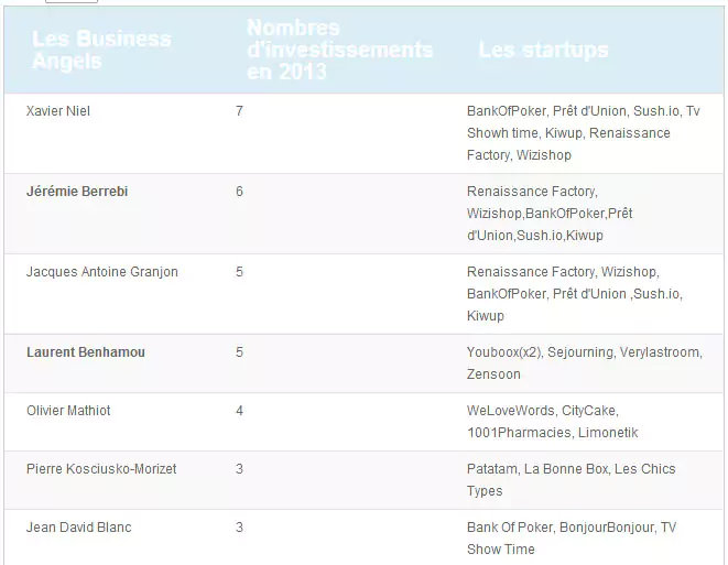 Selon ce classement, c’est donc Xavier Niel qui arrive en tête des investisseurs dans les startups françaises. Ce dernier a pris dans part dans 7 d’entre elles n 2013 : BankOfPoker, Prêt d’Union, Sush.io, Tv Showh time, Kiwup, Renaissance Factory, Wizishop