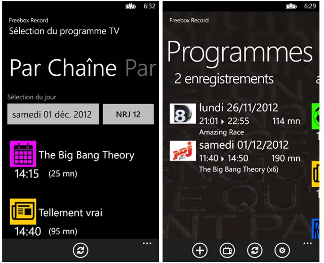 L’application Freebox Record permet de voir les programmes en cours d’enregistrement de votre Freebox (V5-HD et Révolution), de modifier ou supprimer un enregistrement programmé,, de programmer rapidement un enregistrement sur toutes les chaînes et dans les modes (HD, Bas débit, Standard, TNT,…), consulter le programme TV en cours (par chaine, par jour, détail,…), ou encore consulter et programmer un enregistrement de la semaine.