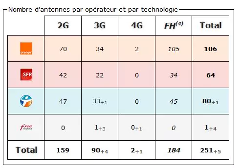 4) FH (faisceau hertzien) : Système de transmission entre les antennes relais. N’est jamais directement capté par un mobile. (chiffre non comptabilisé dans le total des antennes).
