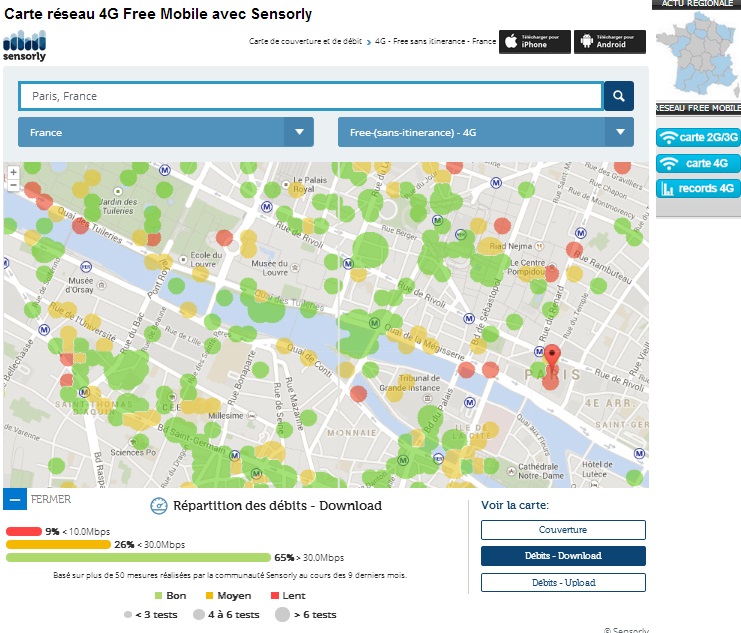 Vous pouvez également télécharger l’application Sensorly disponible sur iOS et/ou Android et devenir ainsi contributeur, permettant d’améliorer constamment les données relevées sur l’application pour juger de la couverture et des débits Free Mobile et des autres opérateurs avec de plus en plus de précision.