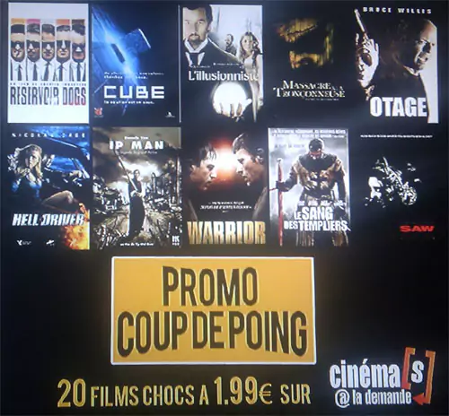 C’est la semaine des promos sur les services de VOD disponibles sur la Freebox. Après Pluzz et son offre à -50%, après Canalplay VOD et sa sélection de films à partir de 1 euro, et après le lancement de Filmo TV, avec le premier mois offert, c’est le service Cinéma @ la demande de proposer d’annoncer une offre. Nommé « promo coup de poing » celle-ci propose 20 films « chocs » à 1,99€. Vous pouvez retrouver ce service, qui propose en particulier les films de la Metroplolitan et une offre 3D, sur le vidéo club de la Freebox.