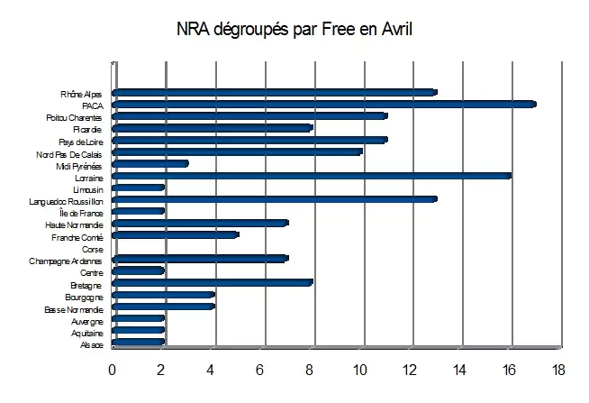 Suite à vos demandes, chaque fin de mois Univers Freebox fera le point sur le nombre réél de NRA dégroupés Free dans toute la France et plus précisément dans votre région, grâce aux données de stats-dégroupage.com. En ce mois d’avril, 149 NRA on été raccordés par Free.Légère baisse de régime comparé au mois de mars mais cela reste tout de même une belle performance En voici un comparatif par région.