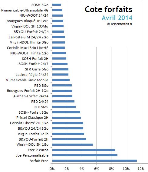 Le site de comparateur de forfaits lebonforfait.fr a publié sa cote des opérateurs mobiles pour le mois d’avril. Ces statistiques sont basées sur le taux de consultations des offres de chaque opérateur, sur 35 000 consultations entre le 1er avril 2014 et le 30 avril 2014