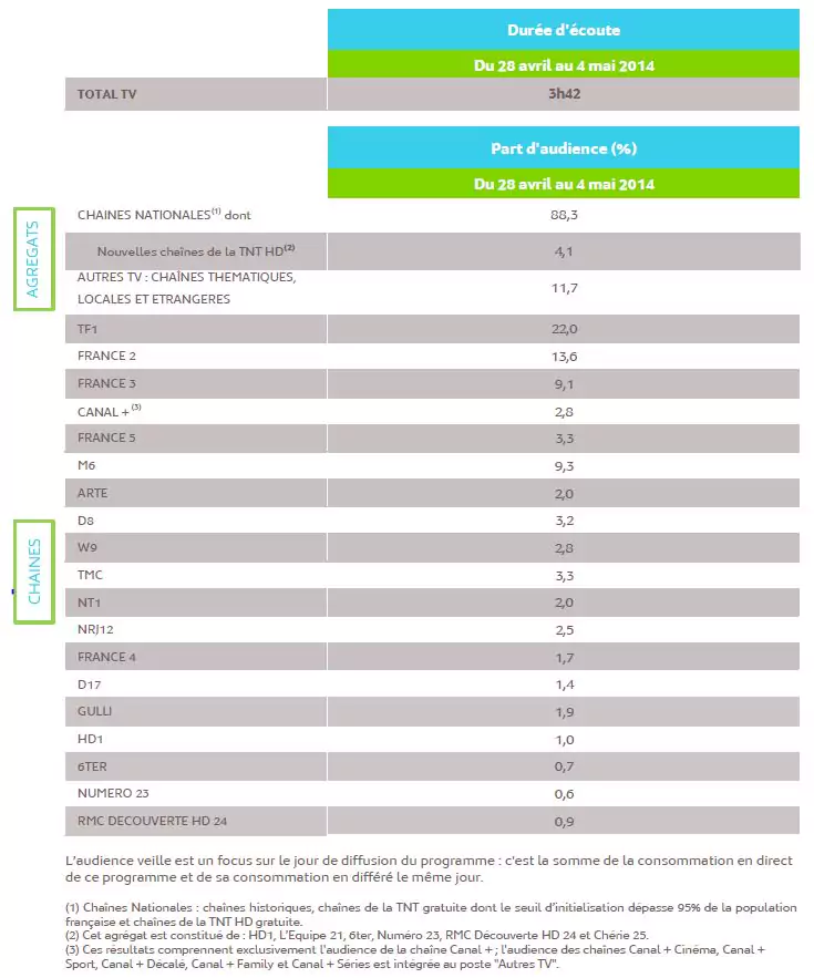 Du 28 avril au 4 mai 2014 la durée d’écoute est de 3h42. Les chaînes nationales (1) y compris les chaînes TNT comptabilisent 88.3 % de part d’audience alors que les autres réunissent 11.7%. TF1 arrive largement en tête avec 22% suivi de France 2 (13.6%) et de M6 (9.3%) qui arrive juste devant France 3 (9.1%). En queue de peloton des chaînes TNT on retrouve 6TER (0.7%) et NUMERO 23 avec 0.6% de part d’audience.