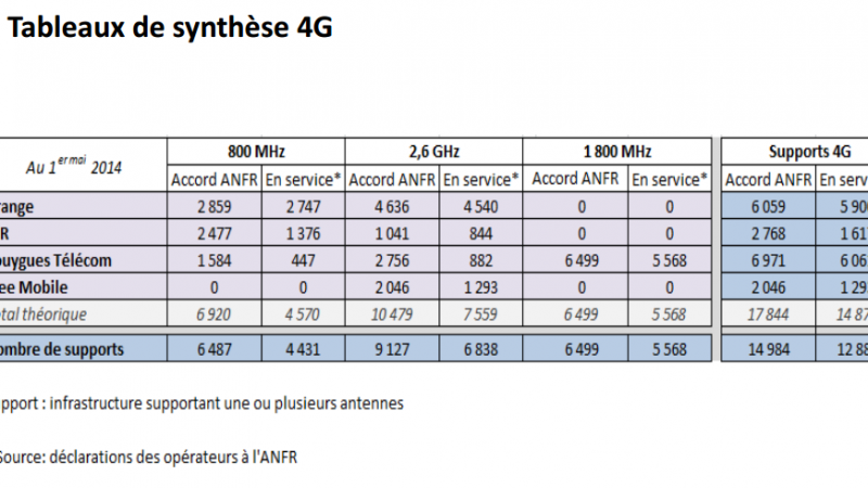 L’Agence Nationale des Fréquences publie aujourd’hui les derniers chiffres de son observatoire mensuel des déploiements des réseaux 2G/3G/4G. Au 1 er mai, la barre des 15 000 sites en 4G tout opérateur confondu n’a pas été franchie (14984 sites) mais 691 nouveaux sites autorisés à émettre en 4G ont été déclarés soit un augmentation de 4,8 % depuis le 1er avril 2014.